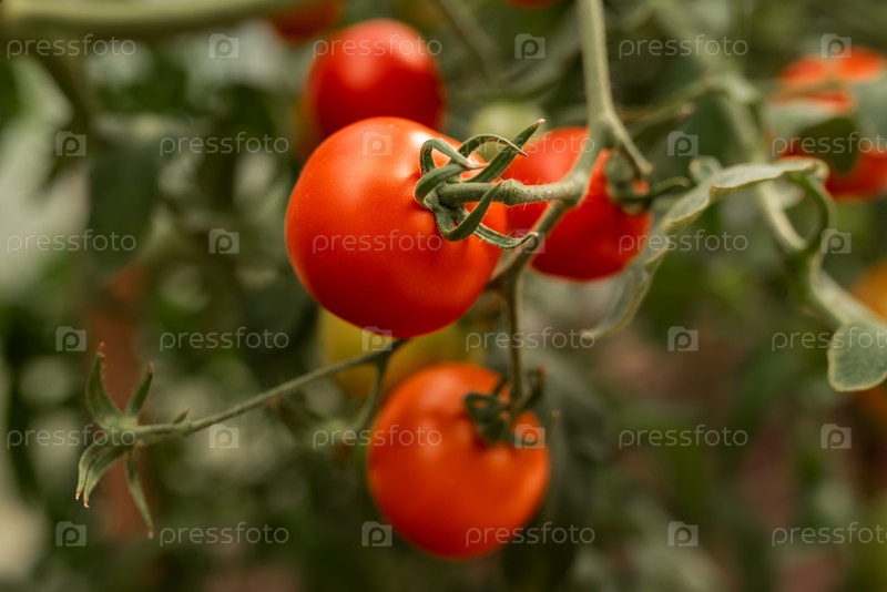 Спелые красные помидоры на ветке в теплице. Продукты питания, овощи, сельское хозяйство. Крупный план