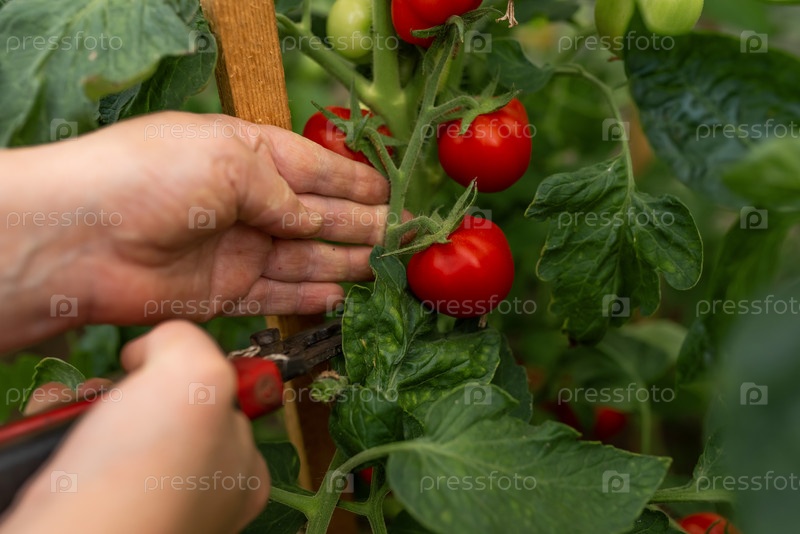 Фермер собирает спелые красные помидоры в экологически чистой теплице. Экологическое и органическое выращивание. Продукты питания, овощи, сельское хозяйство. Крупный план