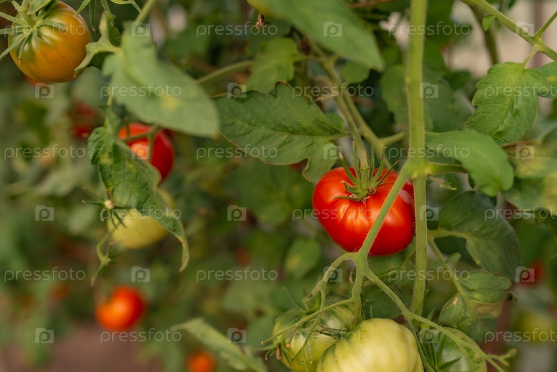 Зеленые и красные помидоры на ветке в теплице. Продукты питания, овощи, сельское хозяйство. Крупный план