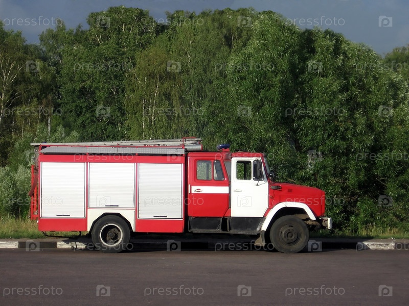 Красная русская пожарная машина на дороге на фоне деревьев