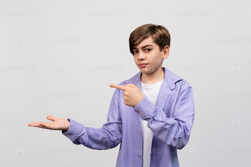 Красивый парень шатен показывает польцем в сторону, влево, рекламирует товары или услуги. Мальчик подросток в белой футболке и сиреневой рубашке стоит на белом фоне