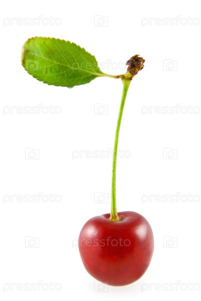 Вишня с зеленым листом на белом фоне