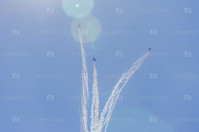 ХУКОВСКИЙ, МОСКОВСКАЯ ОБЛАСТЬ, РОССИЯ - 23 июля 2017 г.: Экспозиции Международного аэрокосмического салона МАКС-2017 в Жуковском, Московская область, Россия. Российская аэрогруппа «Русские витязи»
