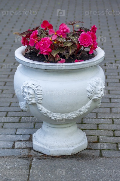 Розовые цветы бегонии в белой антикварной вазе на открытом воздухе