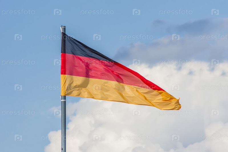 Государственный флаг Германии развевается над голубым небом. Тонированный