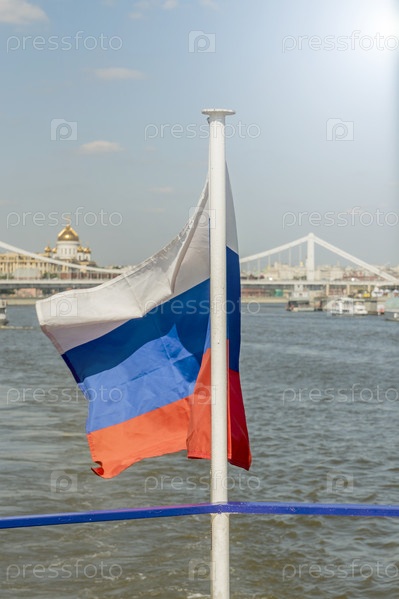Государственный флаг России развевается над лодкой на фоне Москвы