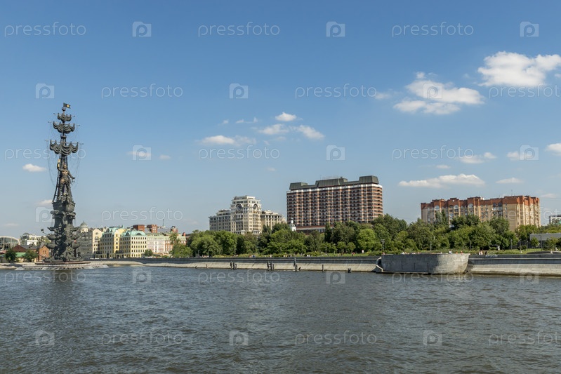Москва, Россия - 10 августа 2017 г.: Вид на набережную Москвы-реки и плавучие пассажирские катера