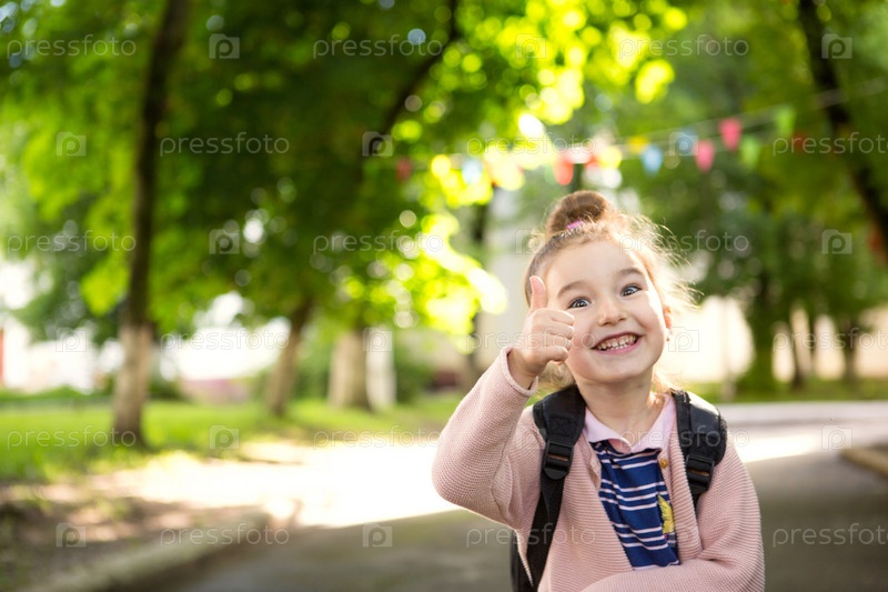 Маленькая девочка внешности в школьной форме с рюкзаком обратно в школу. Начальная школа, развивающие занятия для дошкольников. Место для текста