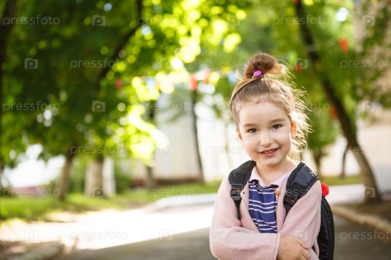 Маленькая девочка внешности в школьной форме с рюкзаком обратно в школу. Начальная школа, развивающие занятия для дошкольников. Место для текста