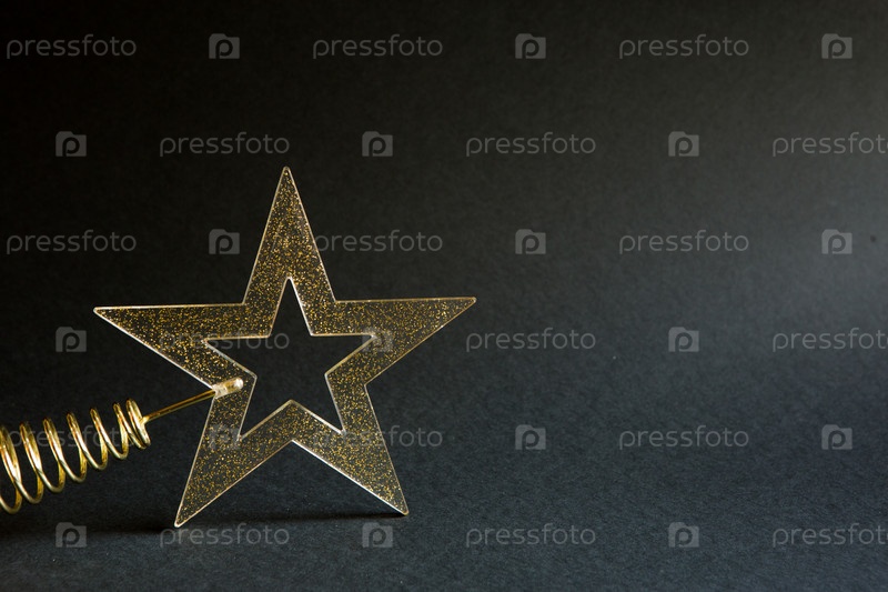 Золотая прозрачная звезда с блестками в форме елки на черном фоне. Новый год, шляпа Санты, подарок, черная пятница. Место для текста
