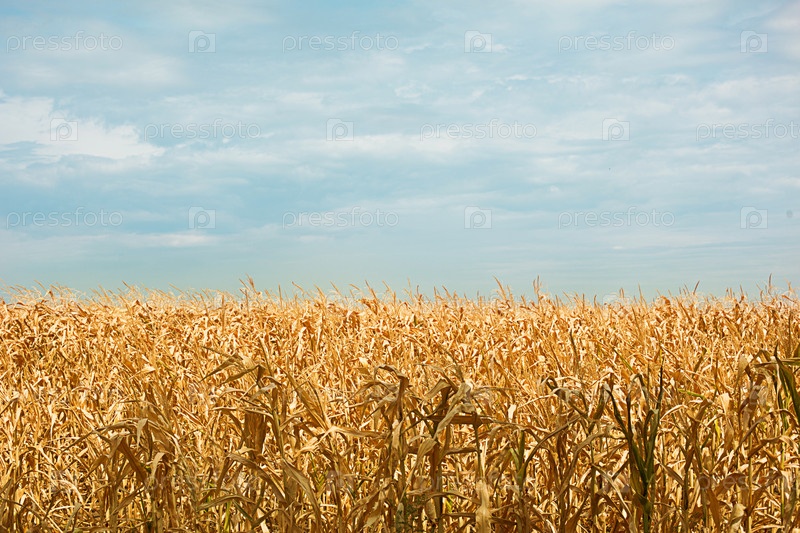 Золотое кукурузное поле. Осенний урожай, сухие стебли. День благодарения, естественный фон