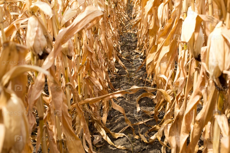Ряды спелой кукурузы на сухой плантации. Тропинка между посадками зерновых культур, грядки с посевами. Место для текста