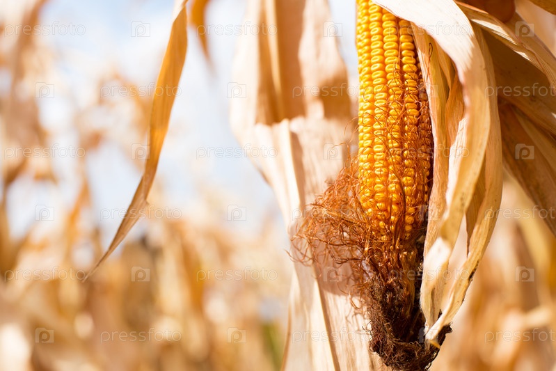 Спелая желтая кукуруза крупным планом на фоне сухого высохшего поля. Зерновые, сельское хозяйство, праздник осеннего урожая, День благодарения. Место для текста