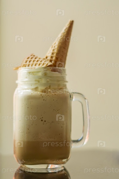 Холодный кофе со взбитыми сливками и вафельным рожком