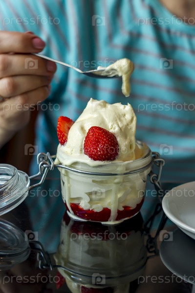 Женщина ест ванильное мороженое с клубничным соусом в банке