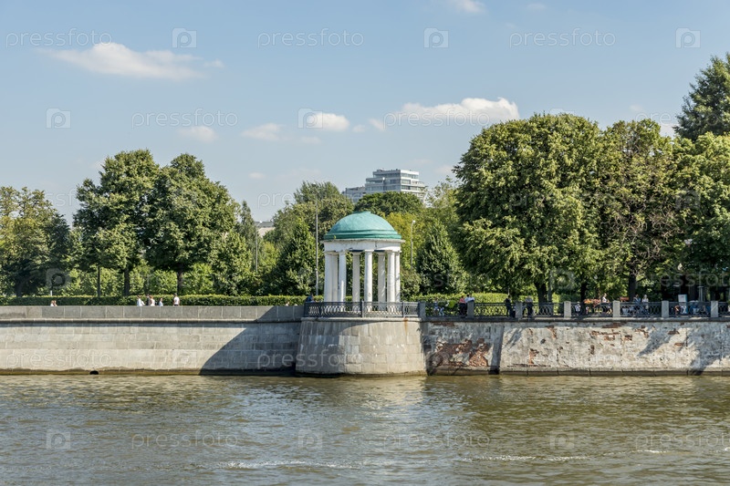 Москва, Россия - 10 августа 2017 г.: Вид на набережную Москвы-реки и плавучие пассажирские катера