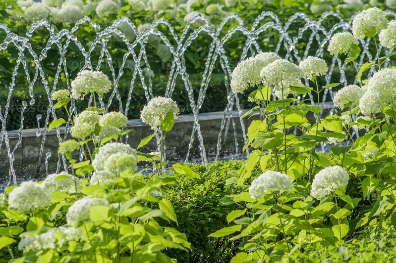 Цветущая белая гортензия на клумбе возле декоративного фонтана