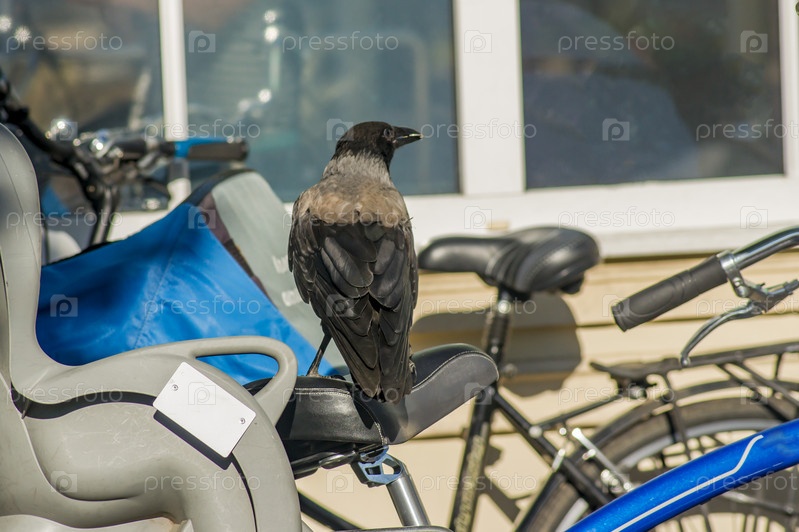 Большая черная ворона сидит на велосипедном сиденье