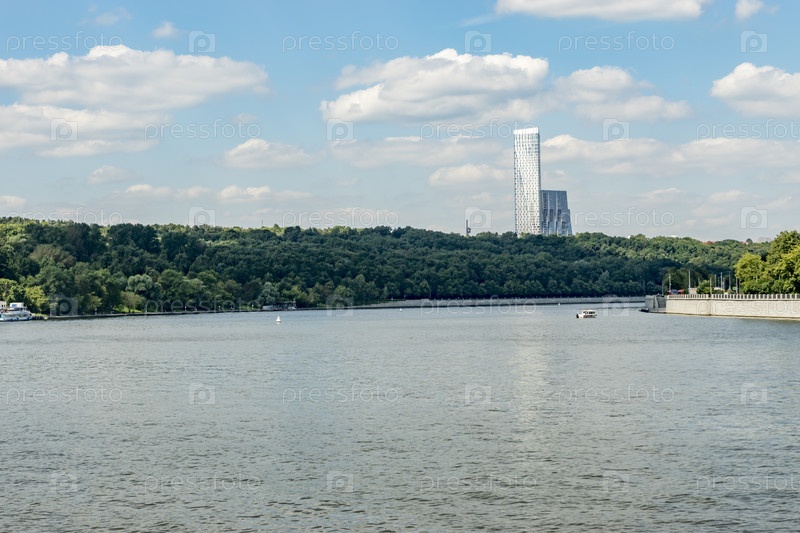 Москва, Россия - 10 августа 2017 г.: Вид на берег Москвы-реки и небоскреб за деревьями