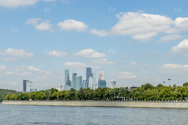 Вид на набережную Москвы-реки и московские небоскребы за деревьями