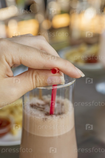 Шоколадный молочный коктейль в женской руке на открытой террасе в летнее время. Тонированный