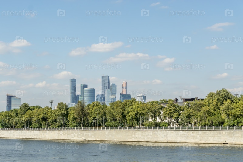 Вид на набережную Москвы-реки и московские небоскребы за деревьями