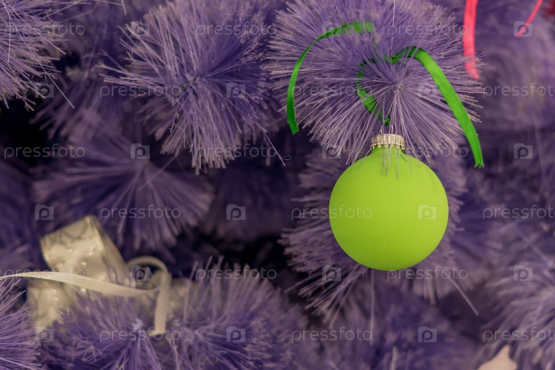Крупный план елочных украшений. Декоративная зеленая безделушка на елке