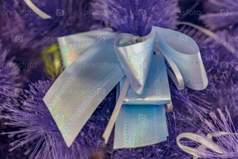 Крупный план елочных украшений. Декоративный фиолетовый бант на елке