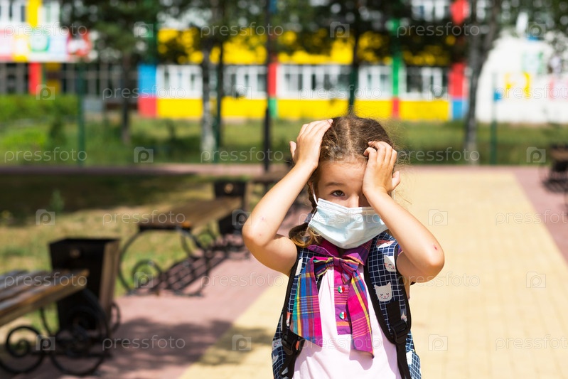 Девушка с рюкзаком возле школы после занятий снимает медицинскую маску, несчастная, усталая и с головной болью. Голову держит руками, кислорода не хватает. Коронавирус, меры безопасности