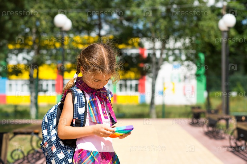 Маленькая девочка с рюкзаком и в школьной форме во дворе школы играет в поп-игрушку. Снова в школу, 1 сентября. Ученик отдыхает после уроков. Начальное образование, начальный класс для ученика