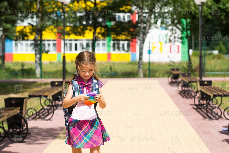 Маленькая девочка с рюкзаком и в школьной форме во дворе школы играет в поп-игрушку. Снова в школу, 1 сентября. Ученик отдыхает после уроков. Начальное образование, начальный класс для ученика