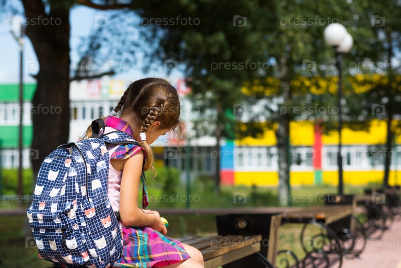 Грустная, расстроенная девушка возле школы с рюкзаком. Усталость от занятий, обида, невыученные уроки, двойка. Обратно в школу. Копировать пространство