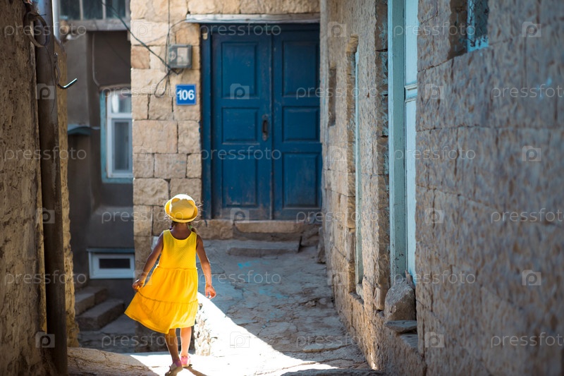 Туристка в желтой шляпе и сарафане идет по улице старого города из камня с крепостью. Тур по достопримечательностям. Ребенок потерялся, ищет родителей