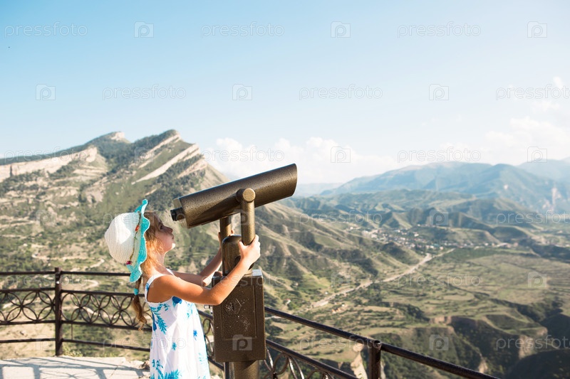 Туристка смотрит в бинокль с высоты на смотровой площадке на горный пейзаж. Тур по достопримечательностям. Дагестан, Кавказские горы
