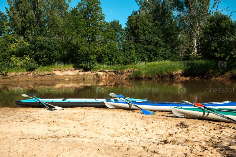 Туристические каноэ с веслами летом стоят на берегу реки во время водного похода. Сплав на надувных и каркасных двухместных и трехместных байдарках, семейный поход, экстремальные приключения летом