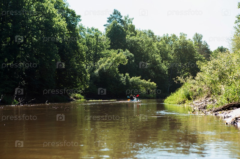 Пара мужчины и женщины в семейной поездке на байдарках, гребной лодке по реке, водному походу, летним приключениям. Экологичный и экстремальный туризм, активный и здоровый образ жизни