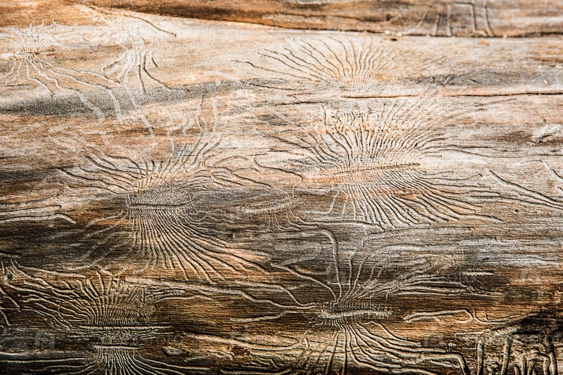 Текстура натурального дерева с линиями, нарисованными короедом в форме пауков. Фон, жук-короед, ствол дерева