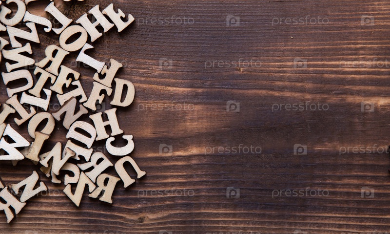Буквы английского алфавита на темном деревянном фоне. Концепция образования, словесные игры, рукоделие. Место для текста