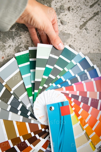 Подбор цвета краски для декоративного ремонта дома по палитре с макетами. Вентилятор оттенков в руке внутри дома. Ремонтно-строительные, лакокрасочные покрытия
