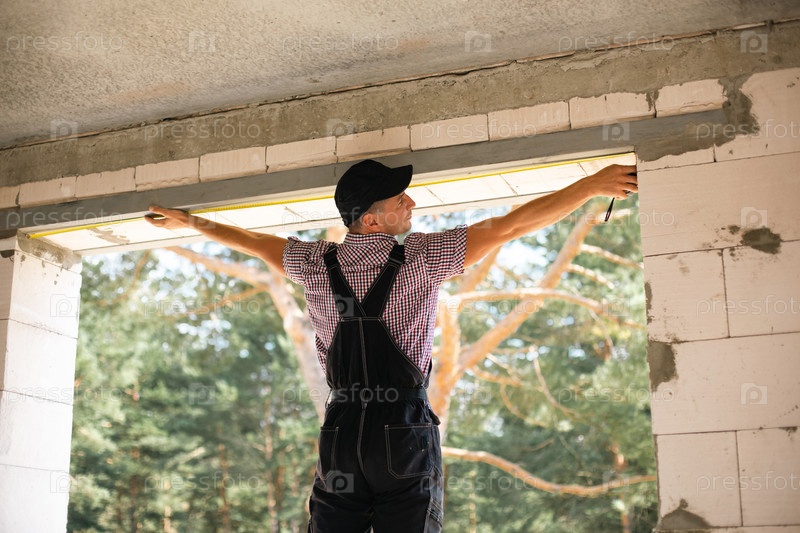 Строитель на строительной площадке измеряет длину оконного проема и кирпичной стены рулеткой. Коттедж из ячеистых бетонных блоков, спецодежда - комбинезон и бейсболка