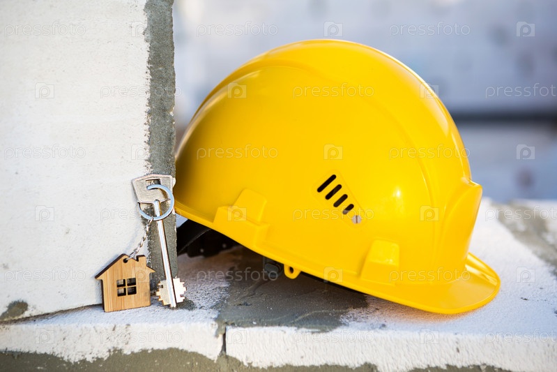 Строительная желтая каска и ключ от дома на окне жилья из блоков пористого бетона. Строительство под ключ, будущий дом, проектирование, строительство. Безопасность труда. Копировать пространство