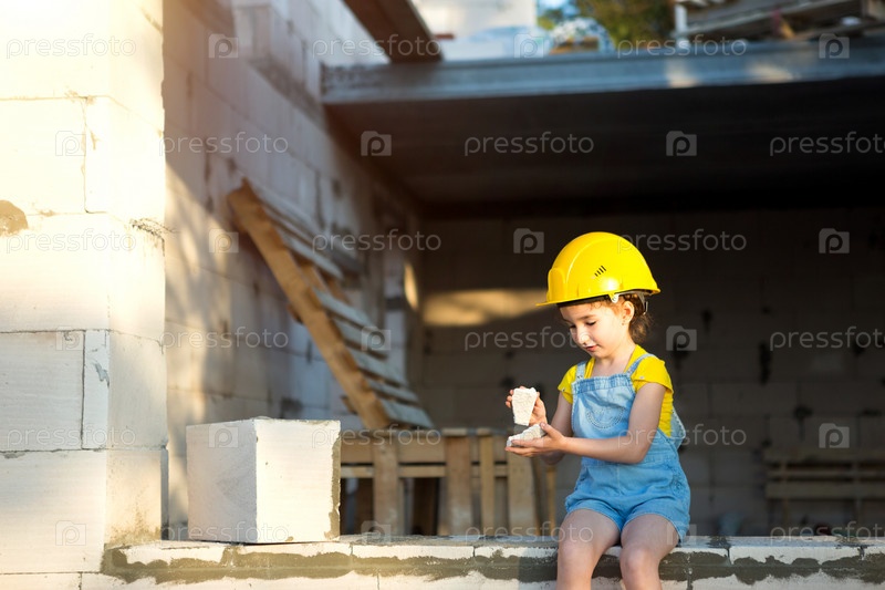 Маленькая девочка в желтой каске играет в строителя на стройке своего будущего дома. Ожидание переезда, выбора профессии, детского образования. Будущая профессия, семейный бизнес