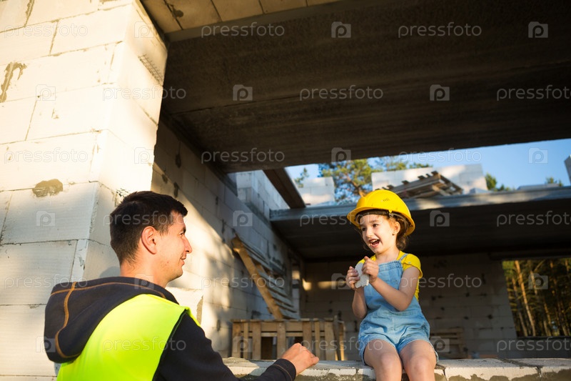 Папа и дочь на стройке своего будущего дома. Ожидание переезда, мечта о доме