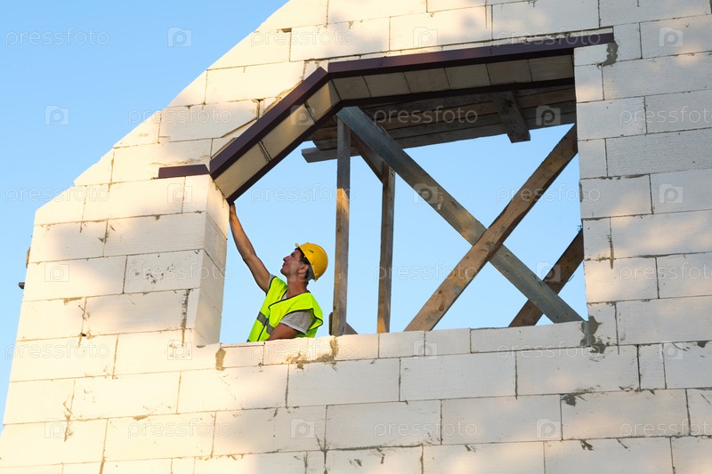 Строитель на строительной площадке измеряет длину оконного проема и стены рулеткой. Коттедж из ячеистых бетонных блоков, защитная одежда - каска и жилет