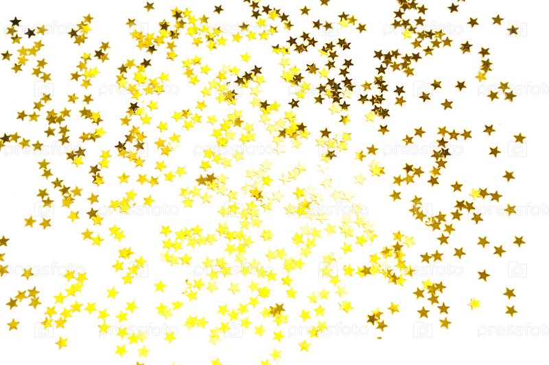 На белом фоне переливаются золотые блестки в виде звездочек. Фоны с копирайтом для праздника, украшения вечеринки, Рождества и Нового года, дня рождения и юбилея. Градиент и текстура