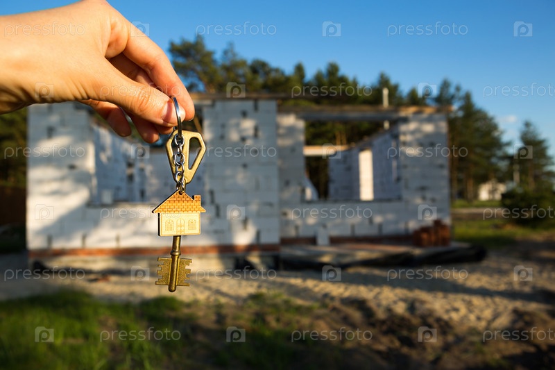 Рука с ключом от будущего дома на фоне строительной площадки и стен из пористого бетонного блока. Строительство дома, переезд в новый коттедж, ферма в деревне