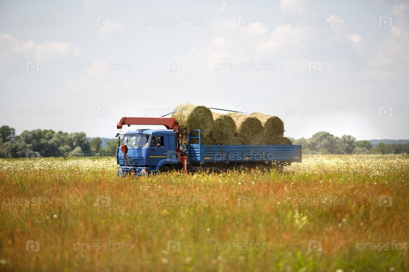 Синий грузовик со стрелкой вывозит с поля круглые стога сена. Заготовка на зиму для скота, сельское хозяйство, животноводство, уборка с полей