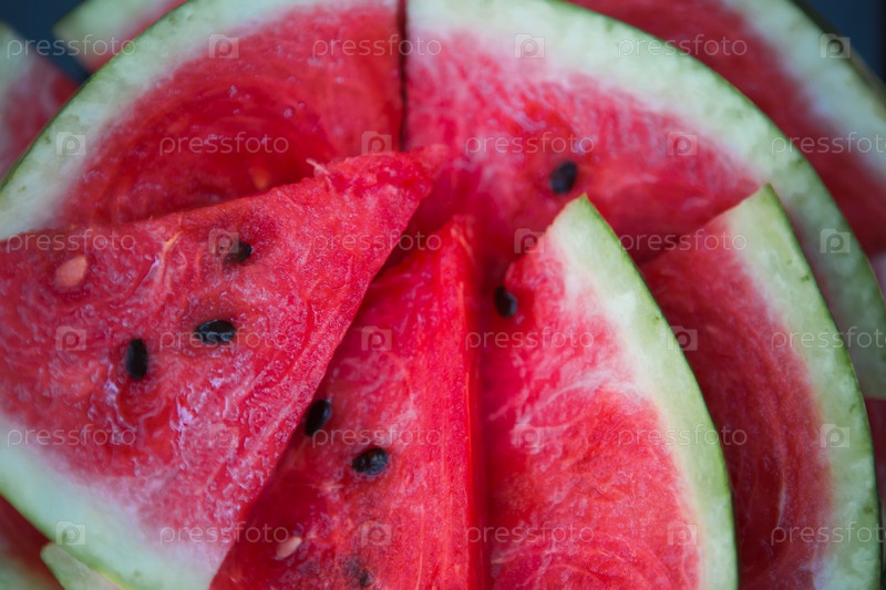 Сочные ярко-красные кусочки нарезанного арбуза