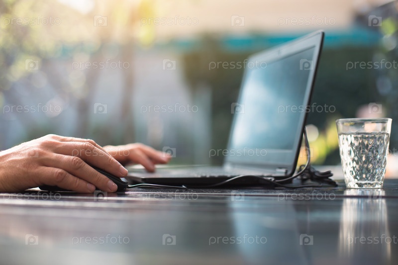 Работа за ноутбуком во дворе под открытым небом - мужские руки крупным планом. Домашний офис, удаленная работа, удаленное местоположение