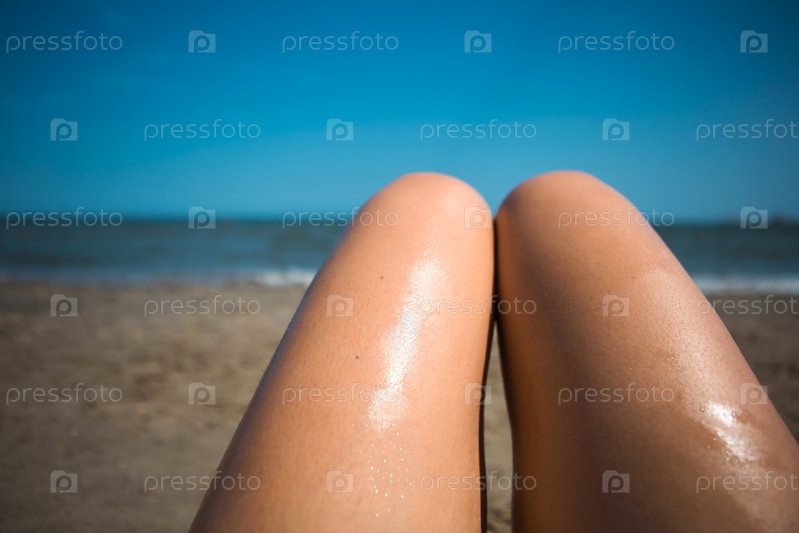 Женщина на пляже мажет ноги солнцезащитным лосьоном из оранжевого тюбика. Уход за кожей, защита от ультрафиолета, солнцезащитный крем. Пляжный отдых